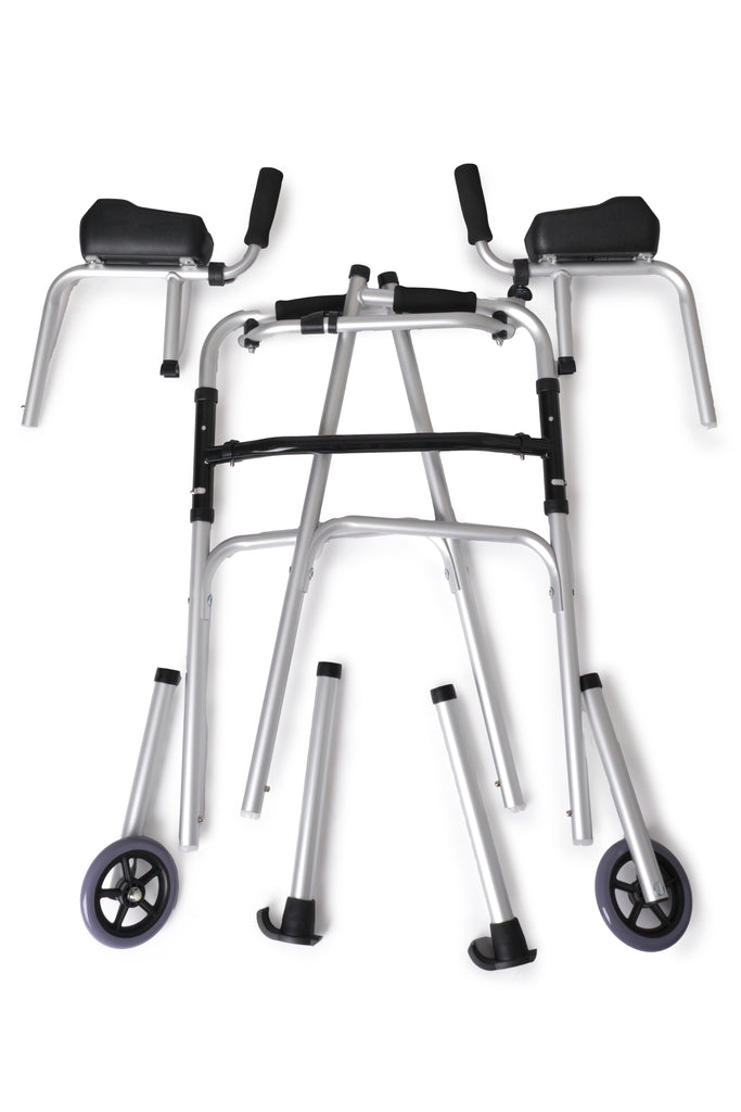 • Klappbarer Gehwagen aus Aluminium, äußerst wetterbeständig und auf jedem Gelände einsetzbar. Ausgestattet mit 2 Vorderrädern und Unterarmstütze. 8-fach höhenverstellbar. Auch die Unterarmlänge ist verstellbar. Maximale Belastung: 100 kg.