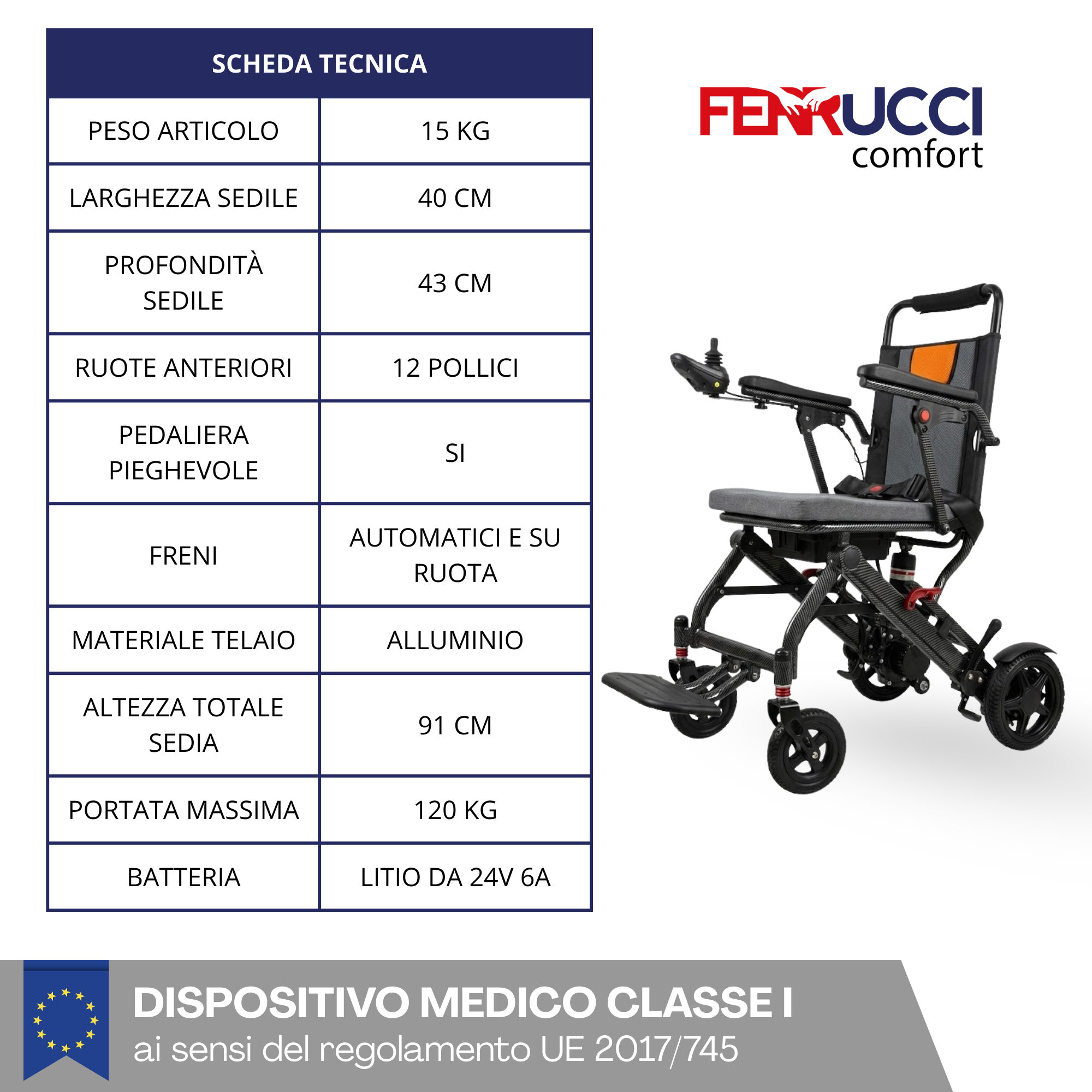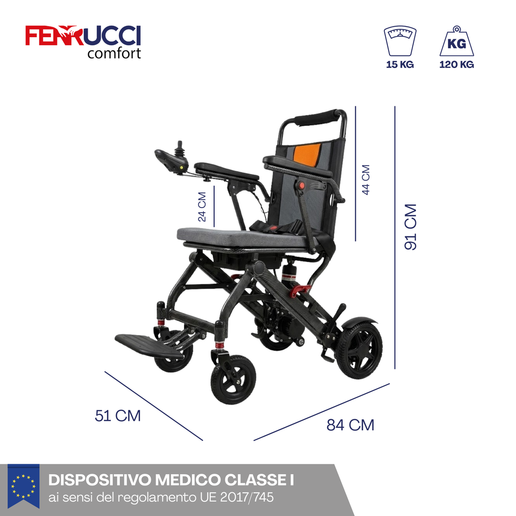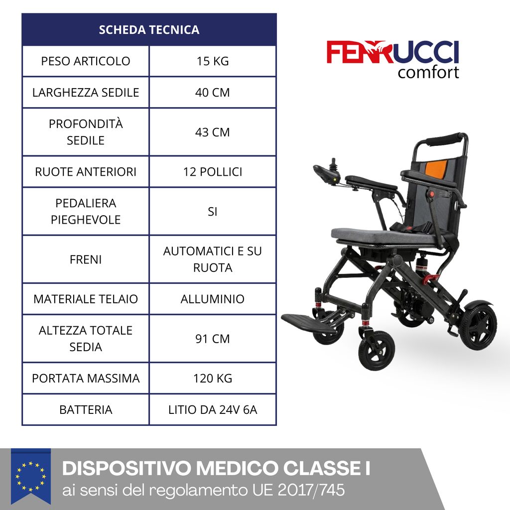 Scopri la carrozzina elettrica pieghevole e da viaggio di Ferrucci Comfort, che ridefinisce il concetto di mobilità personale. Progettata con un focus estremo sulla leggerezza e sulla portabilità, questa carrozzina ti offre l'indipendenza di cui hai bisogno senza compromessi. Perfetta per la casa, i viaggi in aereo o il trasporto in auto, grazie al suo design pieghevole e al peso piuma. La batteria al litio ne consente il trasporto in molti luoghi pubblici tra cui aereo, traghetto, autobus o altro.