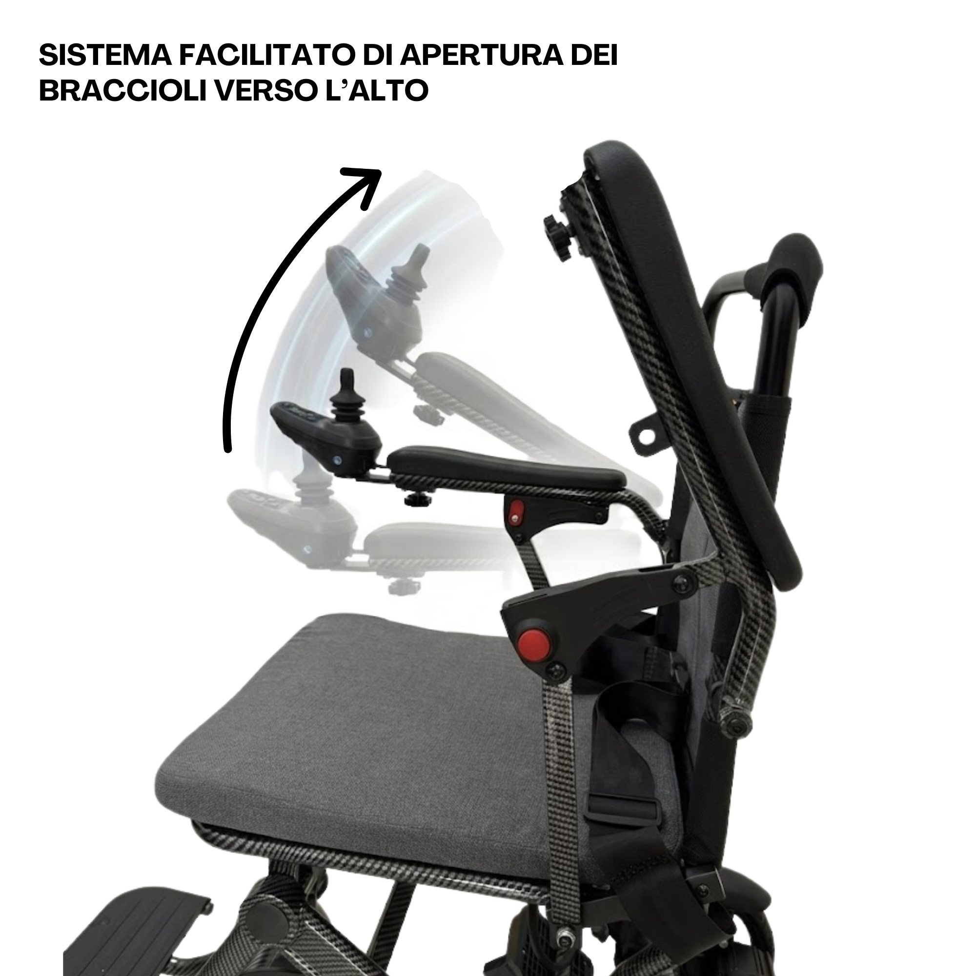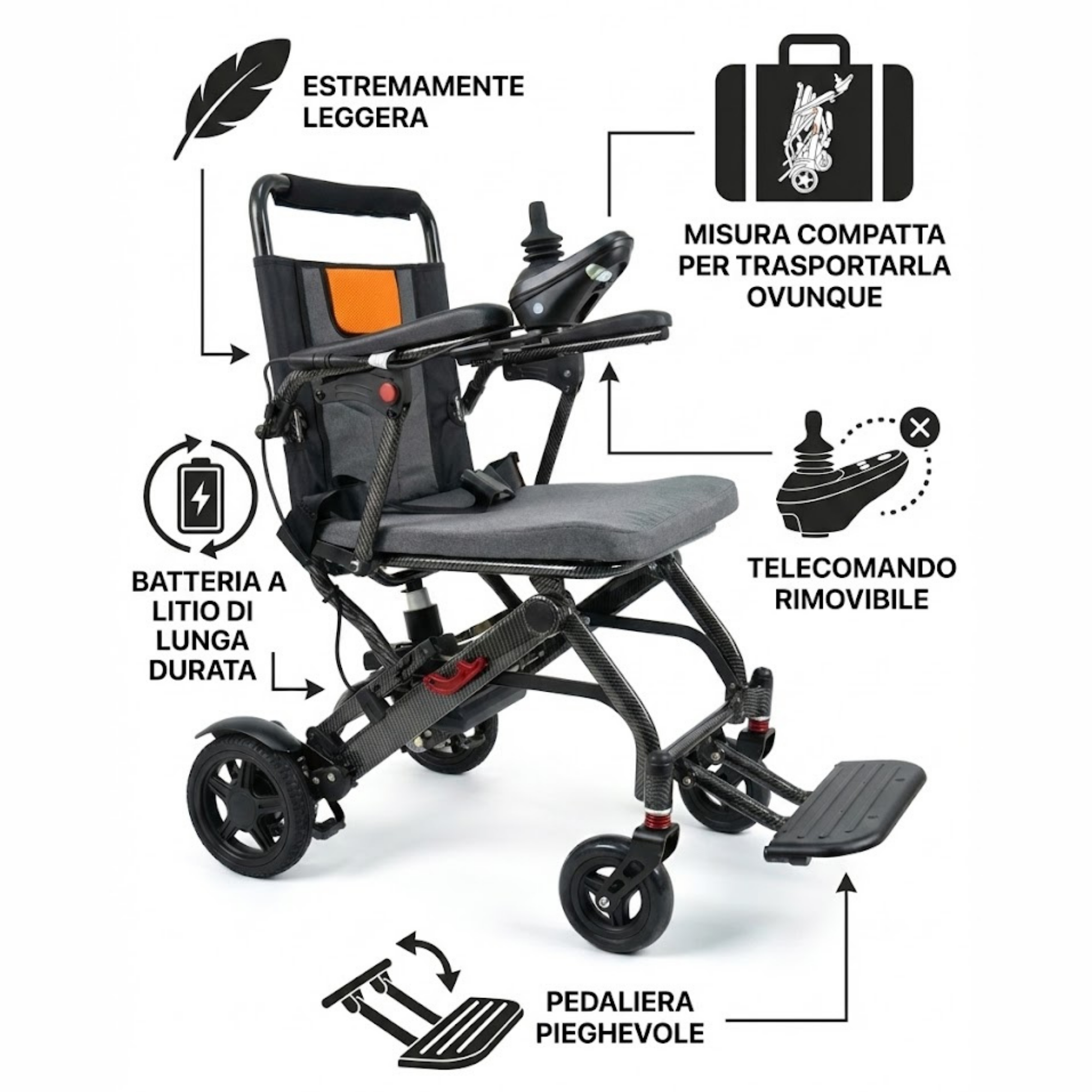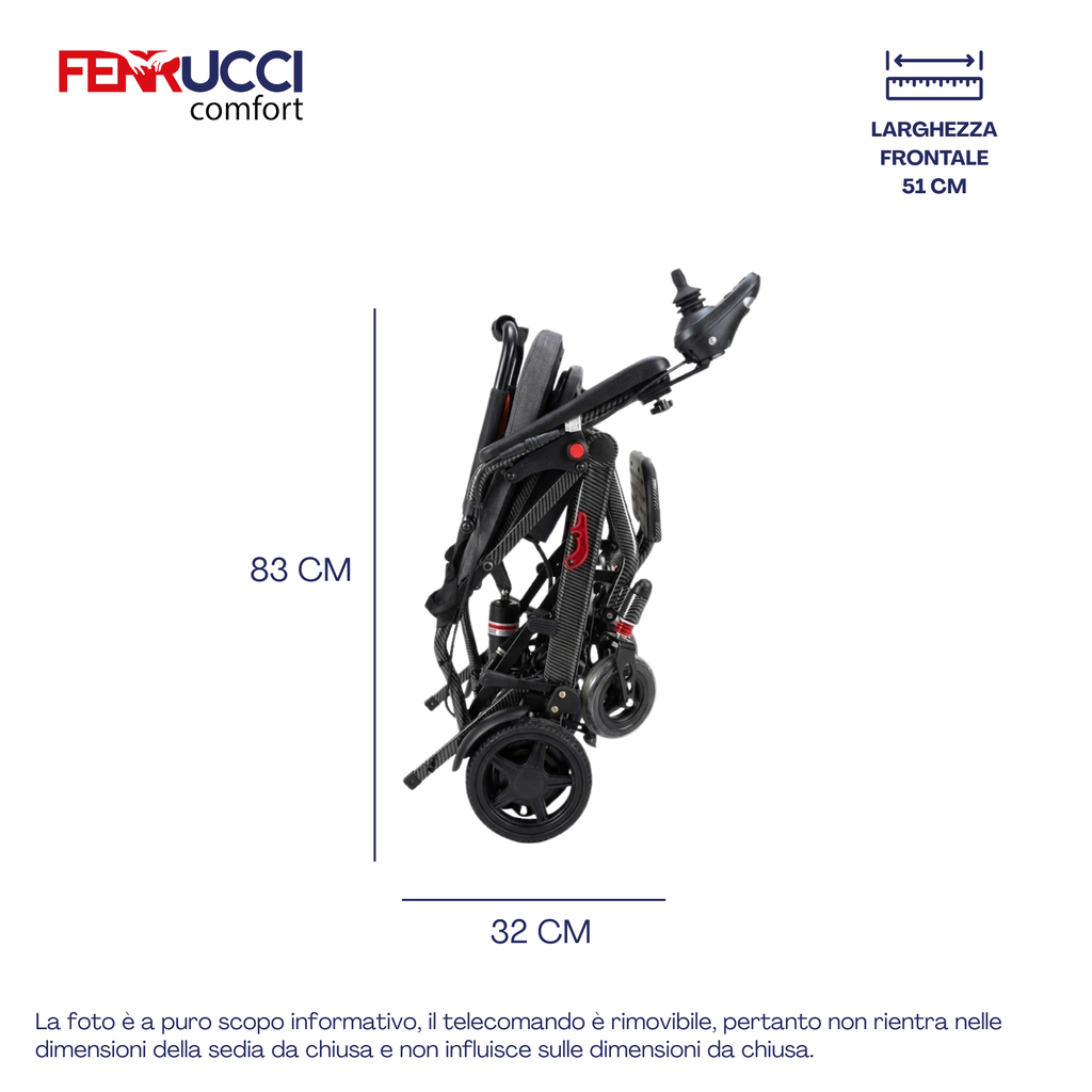 Scopri la carrozzina elettrica pieghevole e da viaggio di Ferrucci Comfort, che ridefinisce il concetto di mobilità personale. Progettata con un focus estremo sulla leggerezza e sulla portabilità, questa carrozzina ti offre l'indipendenza di cui hai bisogno senza compromessi. Perfetta per la casa, i viaggi in aereo o il trasporto in auto, grazie al suo design pieghevole e al peso piuma. La batteria al litio ne consente il trasporto in molti luoghi pubblici tra cui aereo, traghetto, autobus o altro.