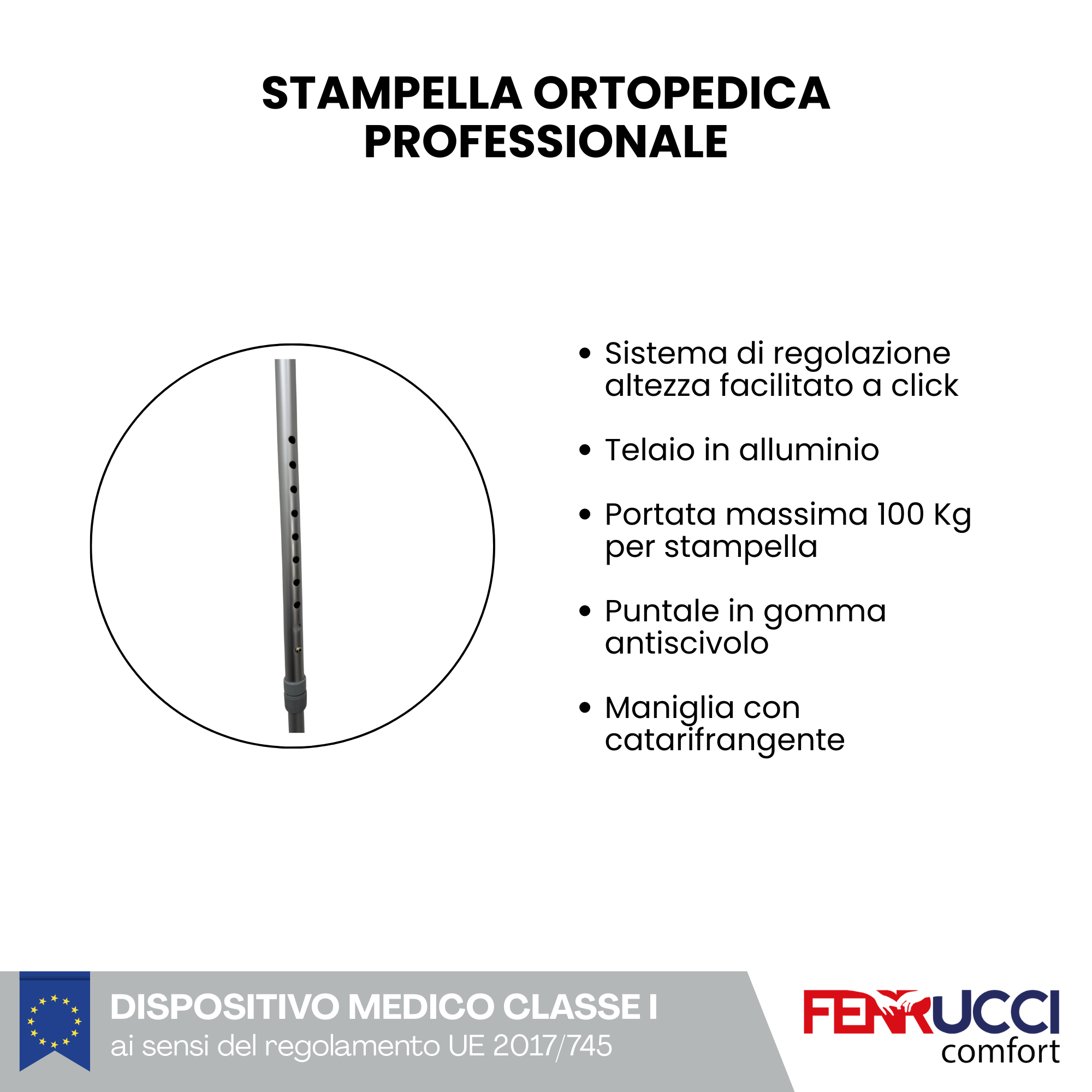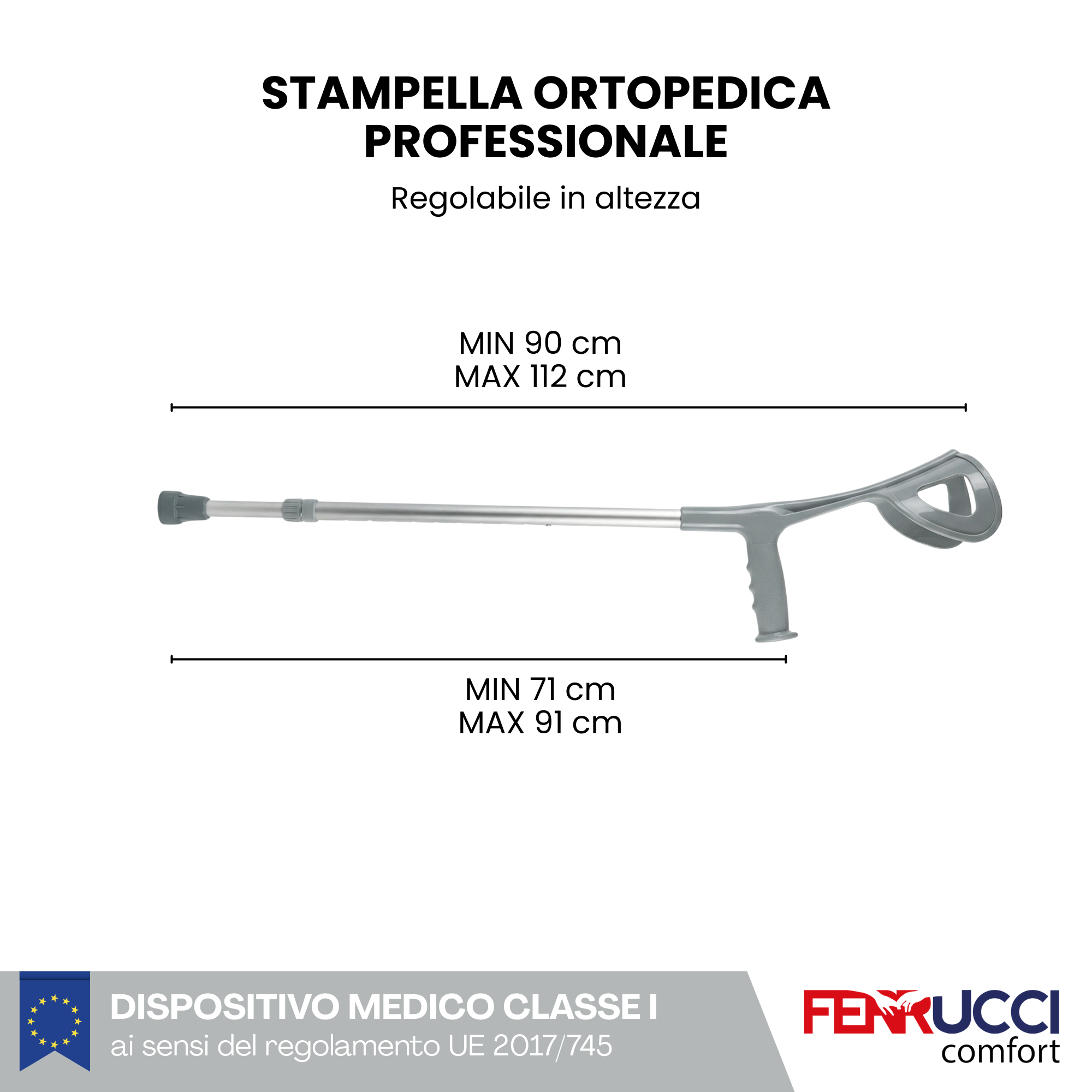 Altezza regolabile, da terra a sotto l’impugnatura: da cm 71 a 91 cm. Appoggio per l'avambraccio in monoblocco di plastica infrangibile.