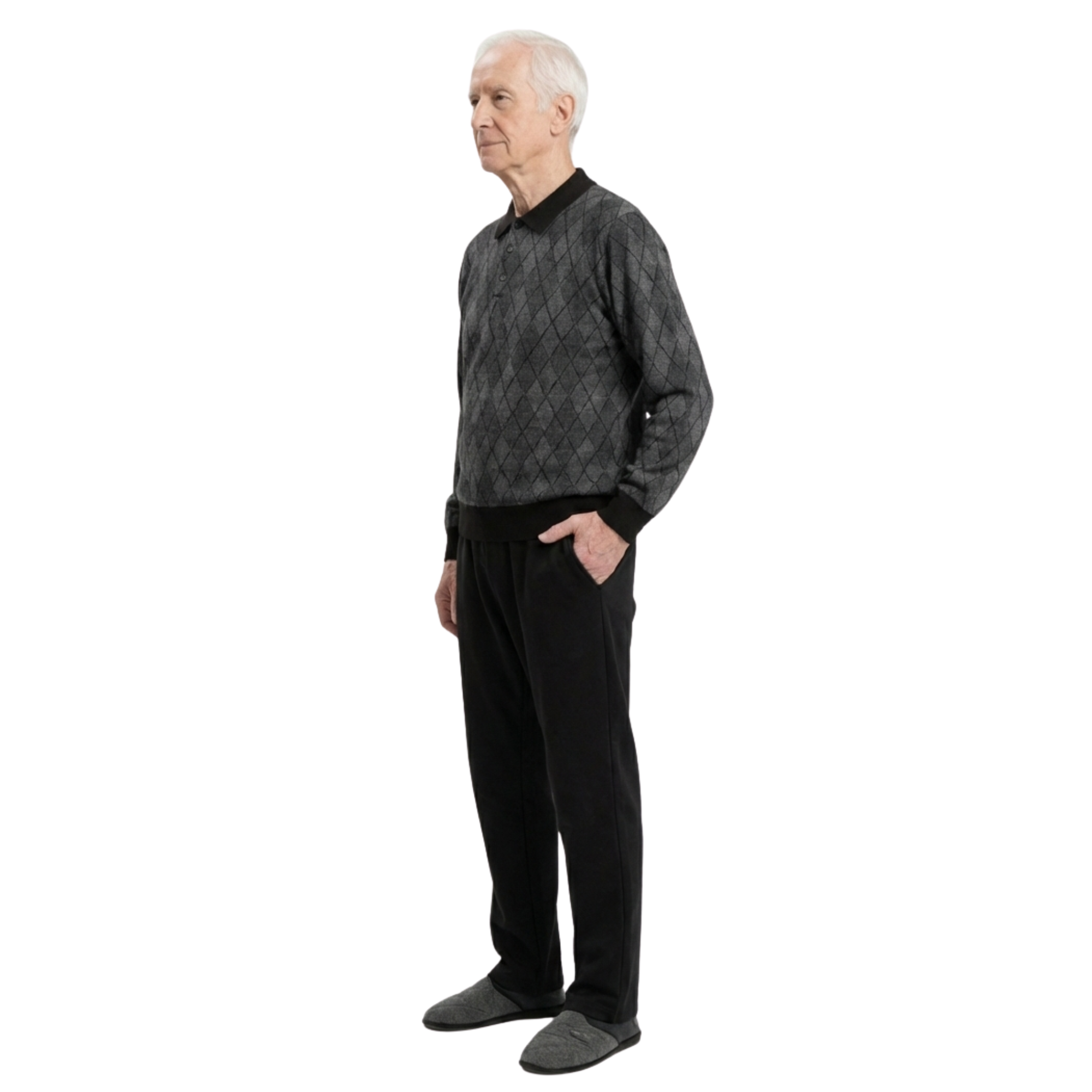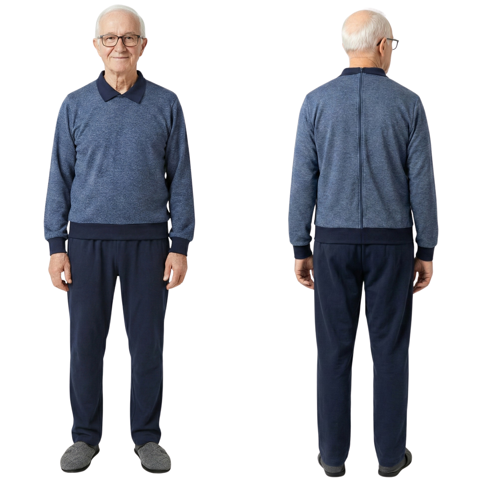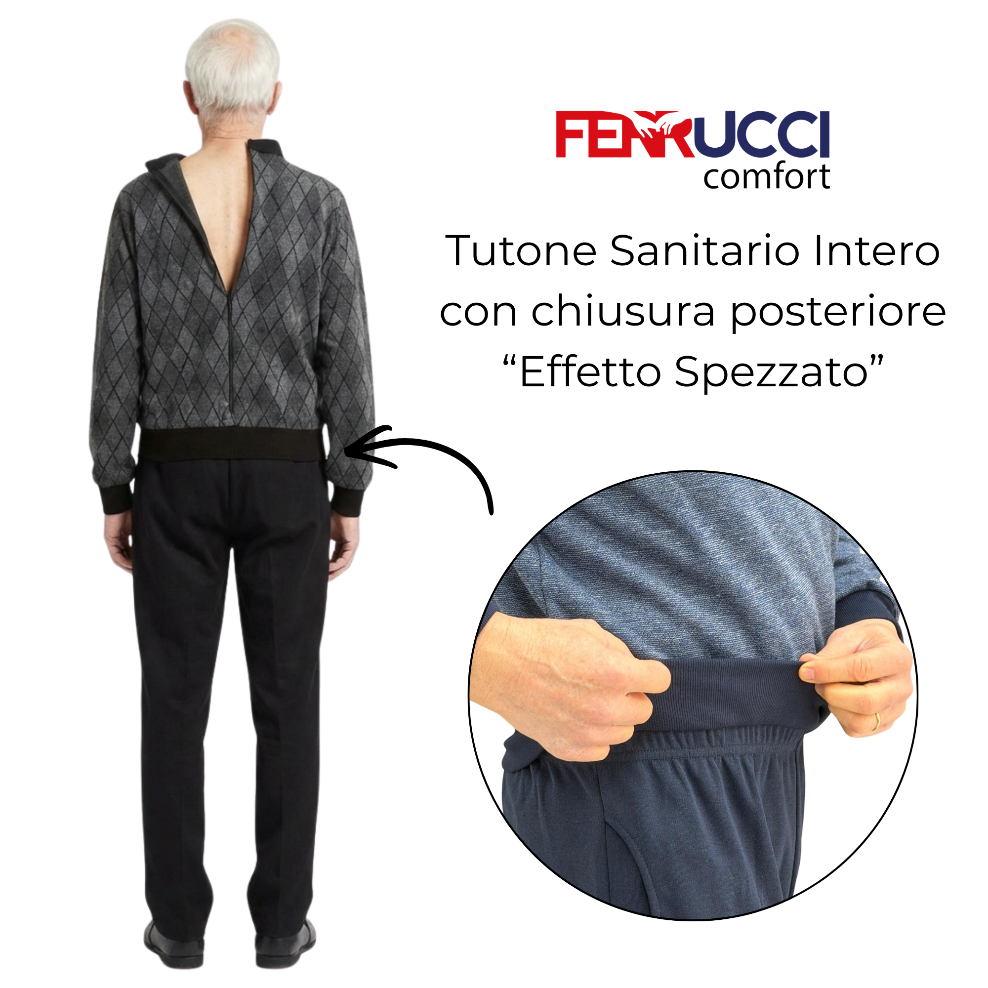 Questo capo è progettato per unire l'estetica di un completo casual alla funzionalità di un dispositivo sanitario. Pur presentandosi visivamente come un doppio capo (pantalone e felpa), si tratta in realtà di una tuta monopezzo che impedisce l'apertura autonoma da parte del paziente. La struttura è completata da pratiche tasche laterali e da una robusta cerniera posteriore posizionata sul dorso, che garantisce al caregiver il massimo controllo e al paziente una totale dignità estetica durante le uscite.