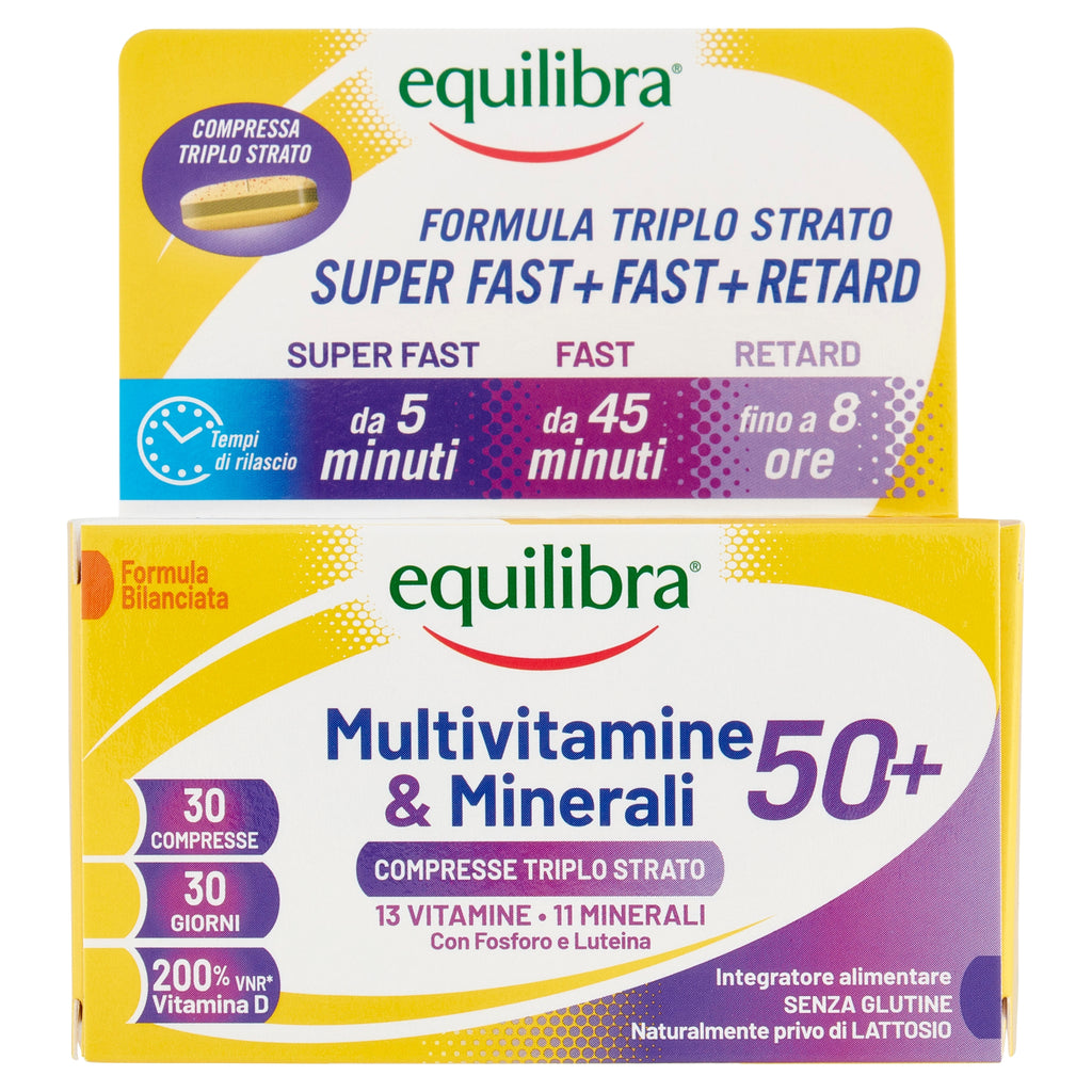Multivitamine & Minerali 50+ Equilibra® è un integratore alimentare a base di Vitamine e Minerali studiato per le esigenze specifiche degli adulti con più di 50 anni, formulato con l’innovativa tecnologia triplo strato che permette un rilascio graduale nel tempo degli attivi ottimizzandone l’assorbimento.